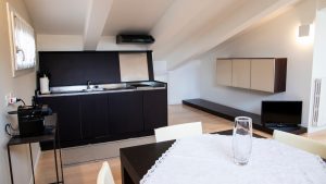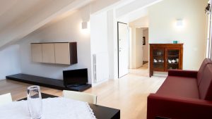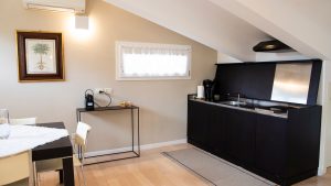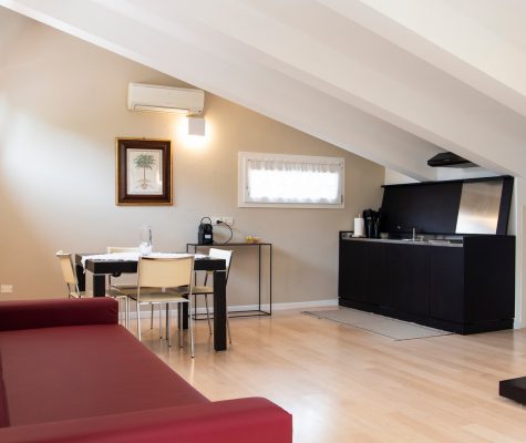 Il pavimento in legno e le linee eleganti dell’arredamento la rendono un’ambiente caldo ma nello stesso tempo estremamente luminoso grazie alle molte finestre.